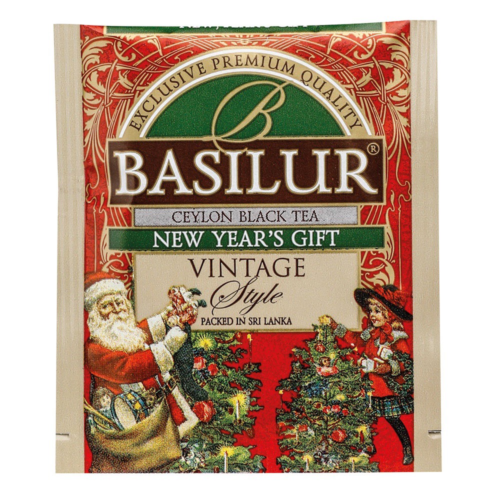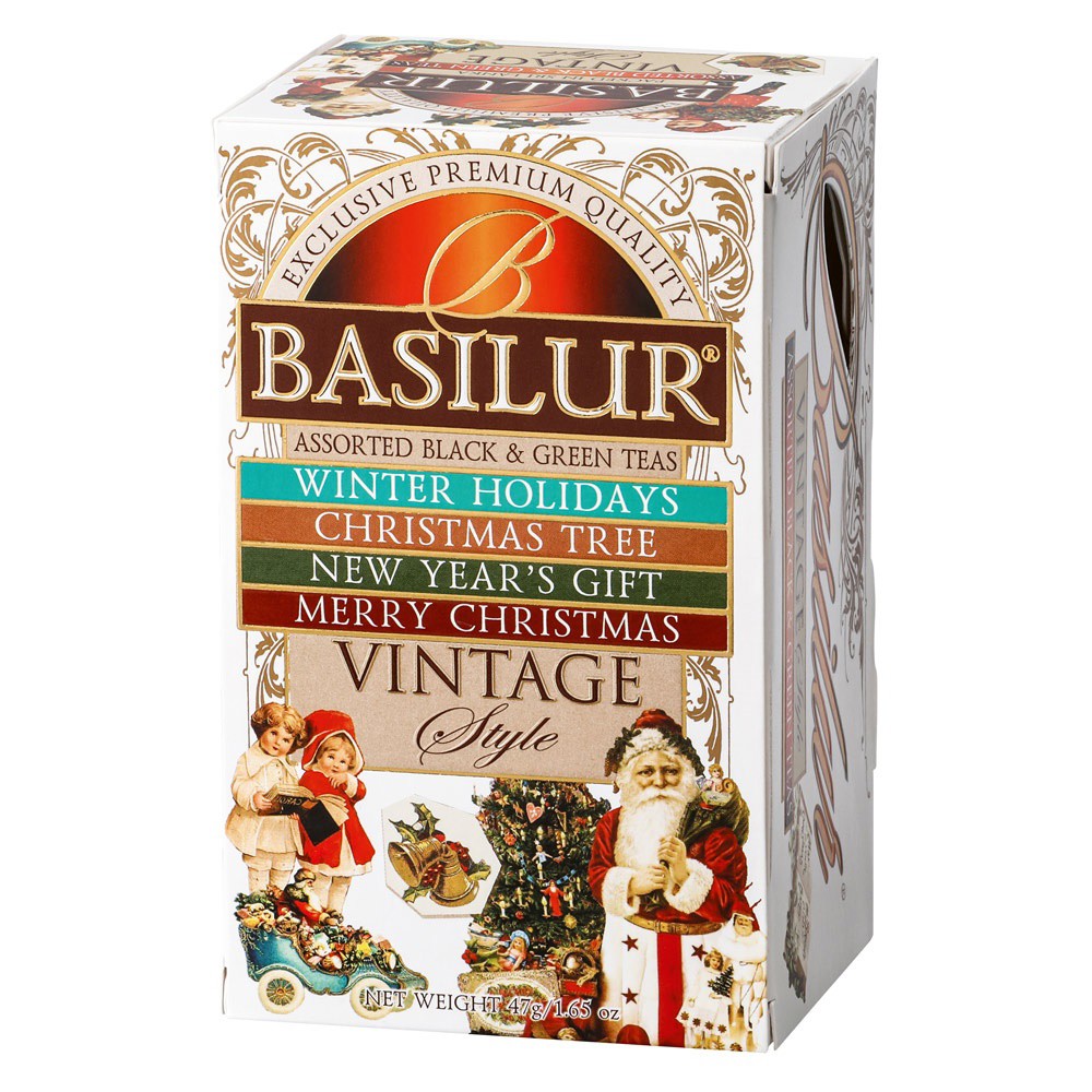 Kolekce 25 porcovaných čajů Basilur, 4× 6 a 1× 7 sáčků. Příchutě: Winter Holidays - černý čaj, aroma (vanilka, jahoda, smetana), New Year's Gift - černý čaj, aroma (třešeň, mandle), Christmas Tree - zelený čaj, aroma (mango, mučenka, limeta), Merry Christmas - černý čaj, aroma (zázvor, med, vanilka), 47 g. 80 × 130 × 68 mm