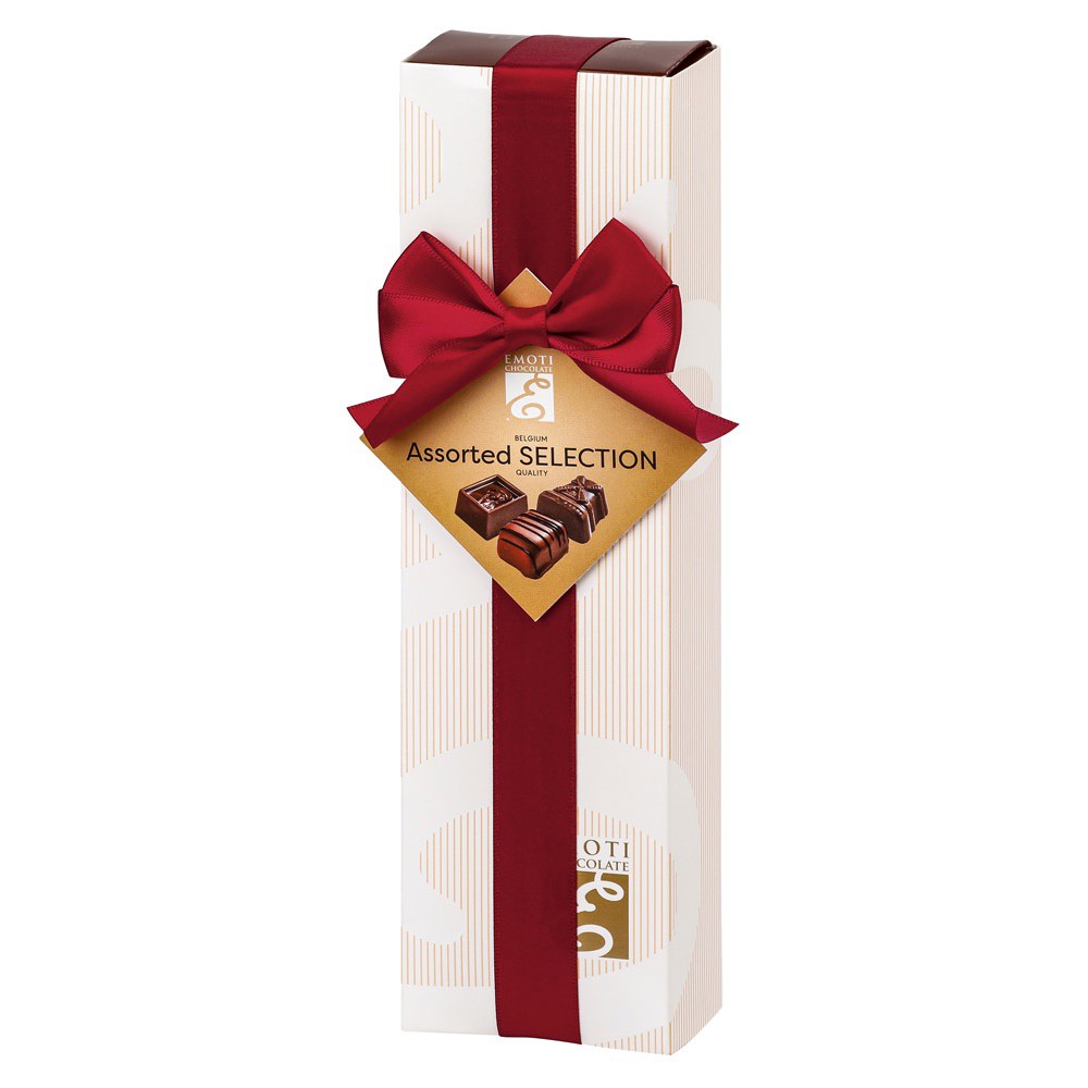 Výběr pralinek z mléčné a tmavé čokolády, lískooříšková náplň marcipán, 65 g. 60 × 37 × 216 mm