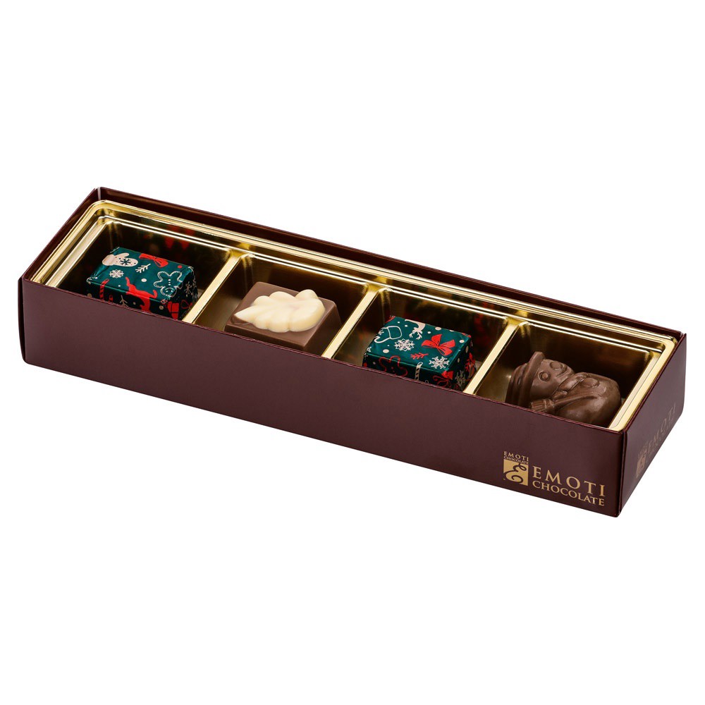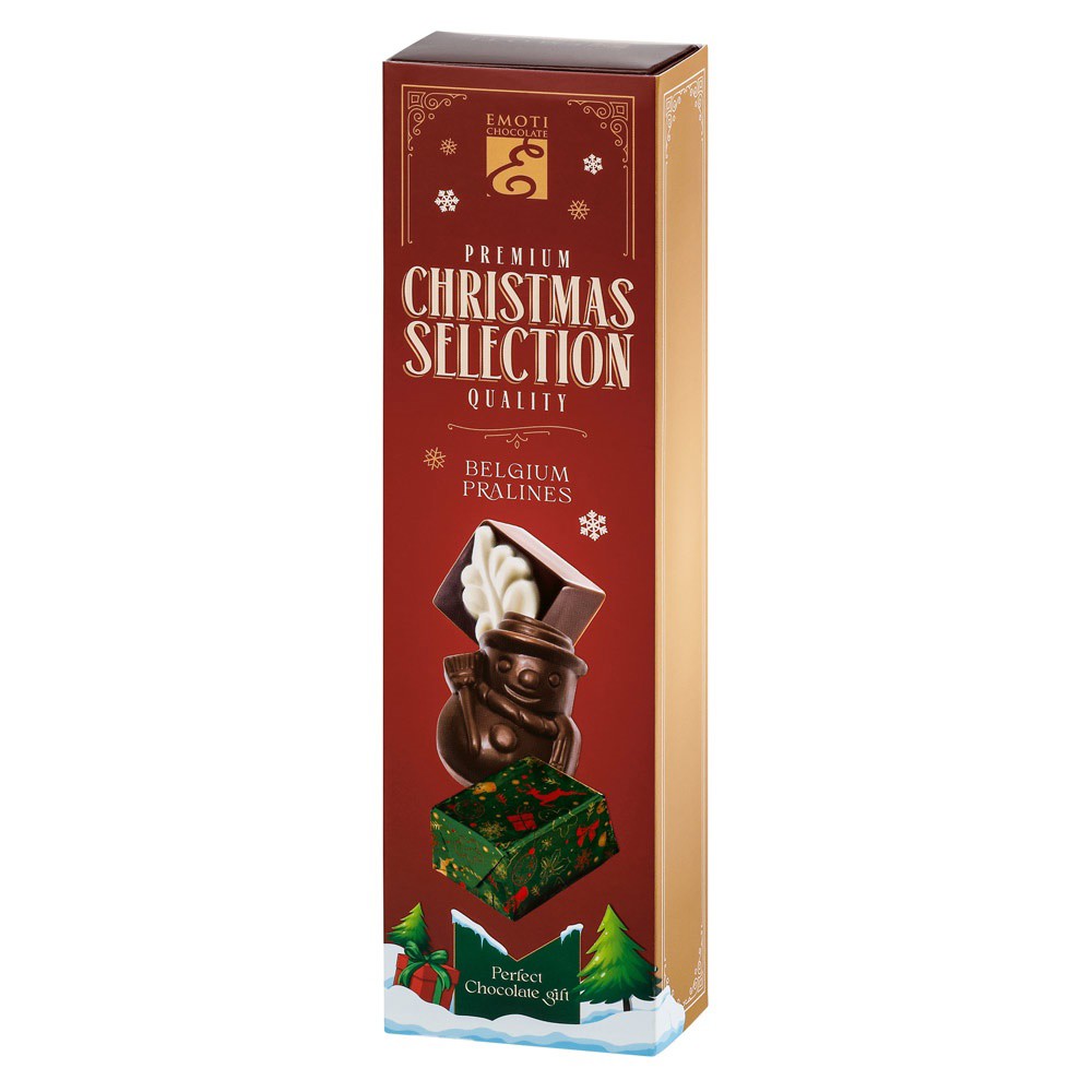 Výběr vánočních pralinek z mléčné čokolády, lískooříšková náplň brésilienne, 60 g. 60 × 37 × 216 mm