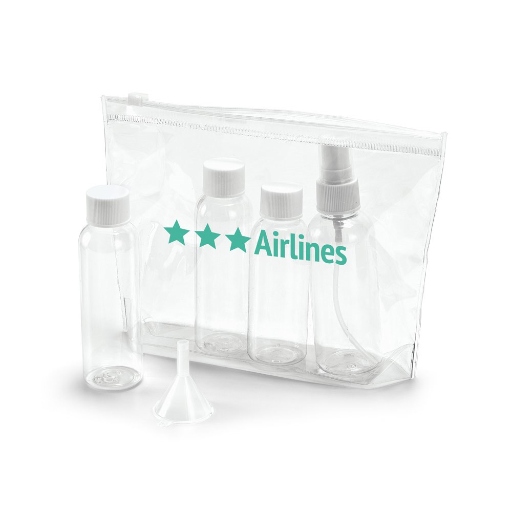 Vodotěsná kosmetická taška z PVC, jejíž součástí jsou 3 lahvičky (2x 65 ml a 1x 60 ml), 1 rozprašovač (80 ml) a 1 nálevka. Ideální pro cestování letadlem. 190 x 155 x 40 mm