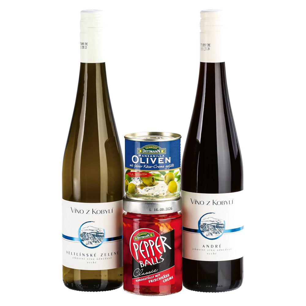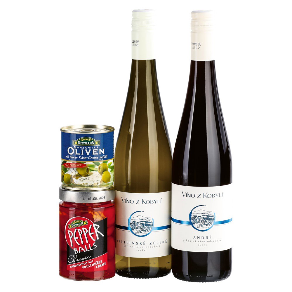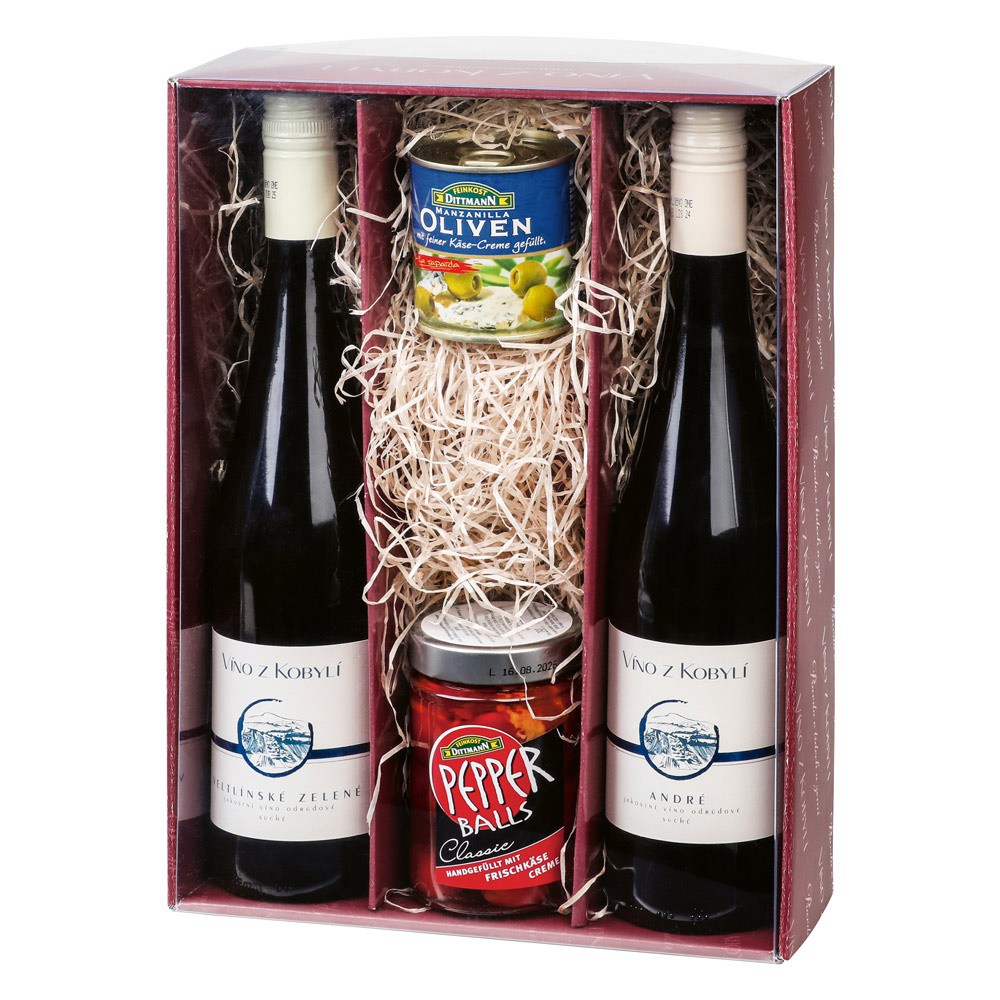 Dárkový set v krabici s průhledným víkem. Obsahuje bílé víno suché Veltlínské zelené (750ml), červené víno suché André (750 ml), papriky plněné čerstvým sýrem a olivy se sýrem s modrou plísní. 236 × 341 × 87 mm