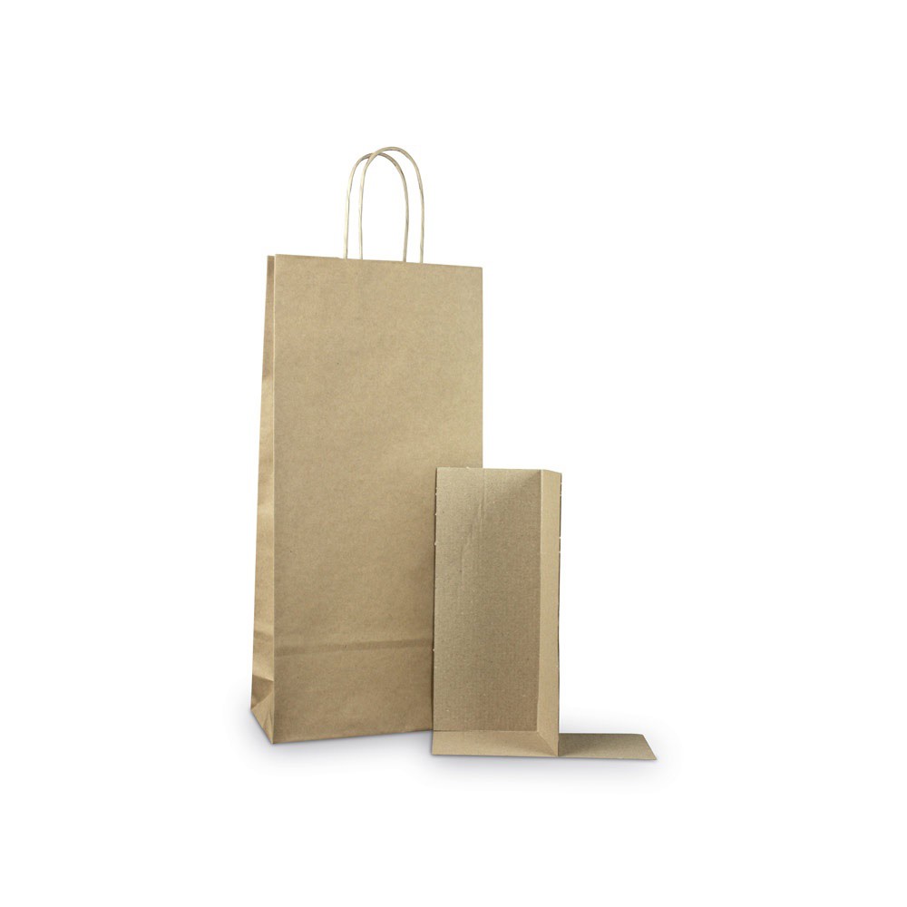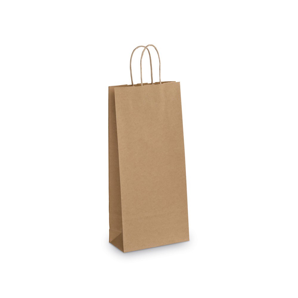 Taška na dvě láhve vína z kraftového papíru, kroucená papírová držadla. Součástí karton na proložení láhví uvnitř. 180 × 390 × 80 mm