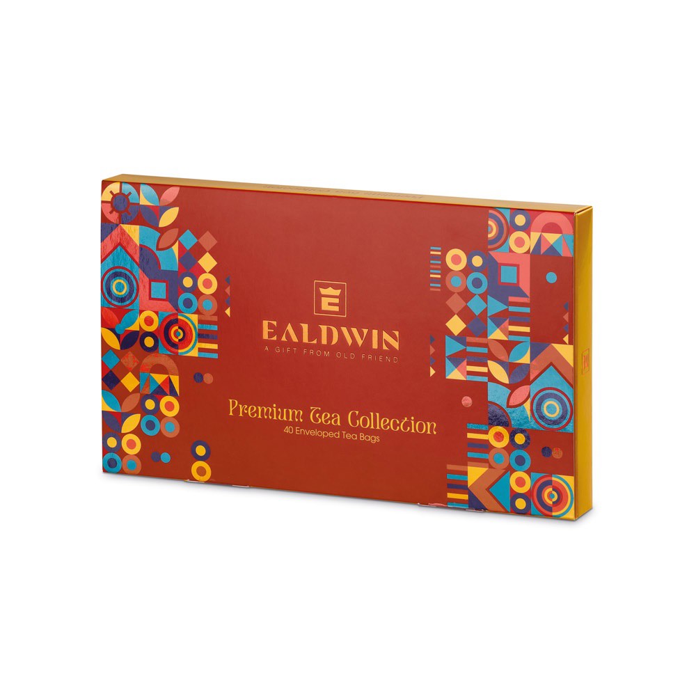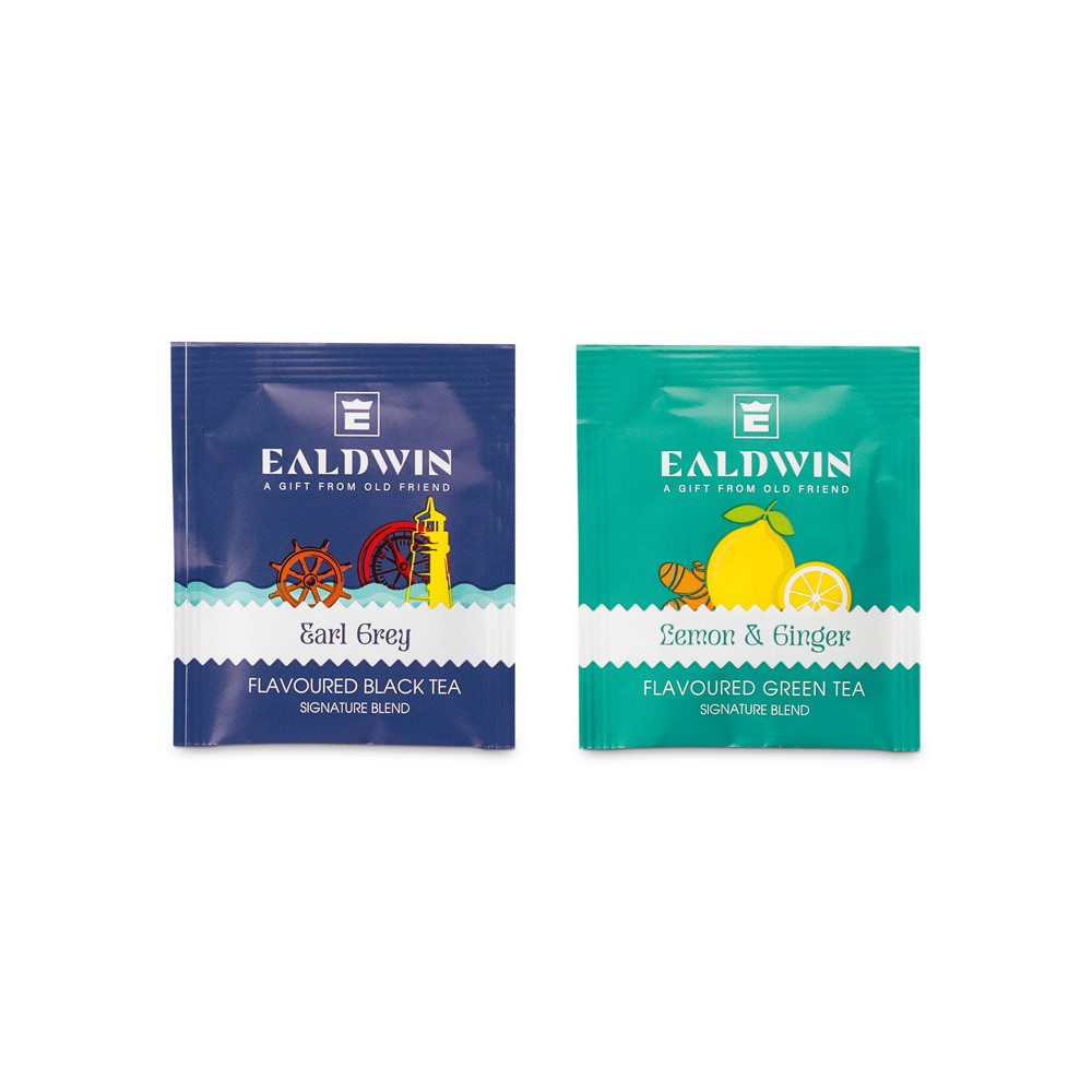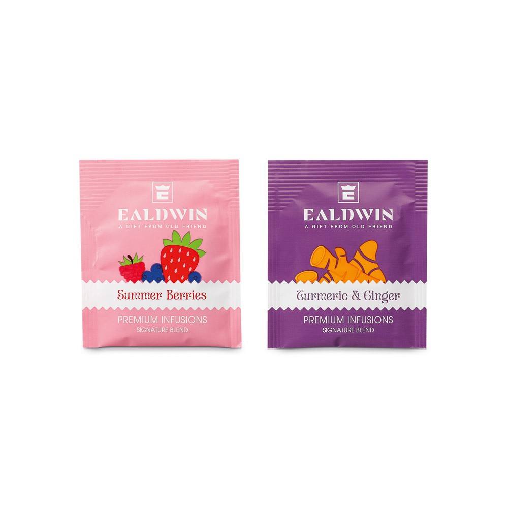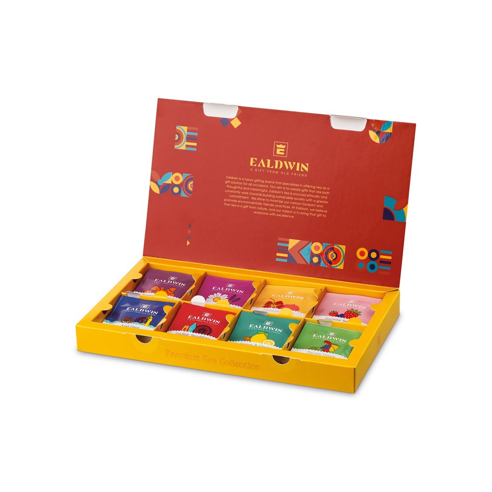 Kolekce porcovaných čajů, 8× 5 sáčků. Příchutě English Breakfast, Earl Grey, Nature Green, Lemon & Ginger, Turmeric & Ginger, Hibiscus & Rose, Summer Berries, Chamomile & Lavender. 300 × 180 × 30 mm