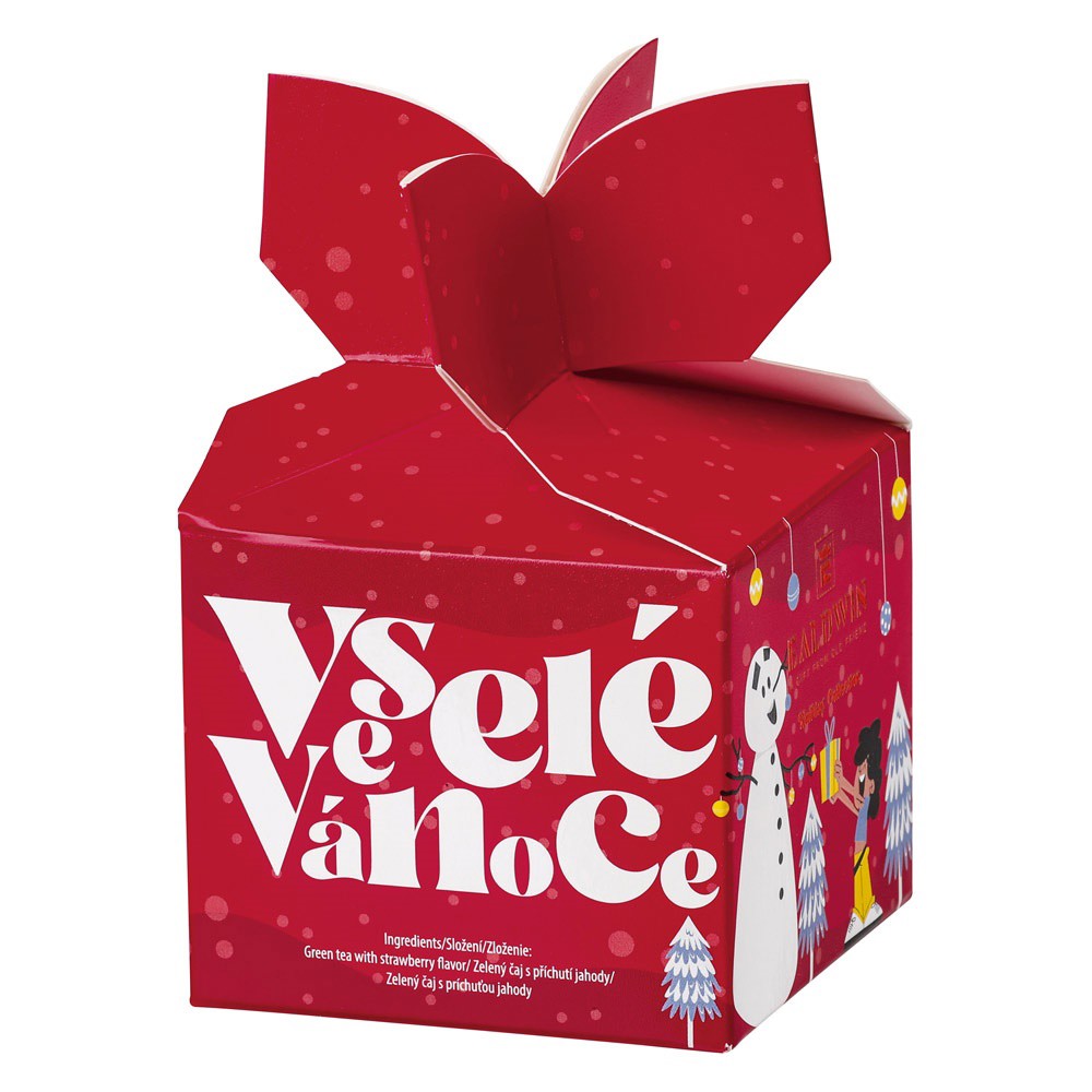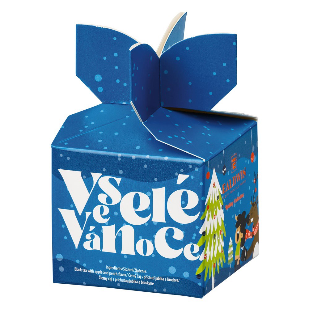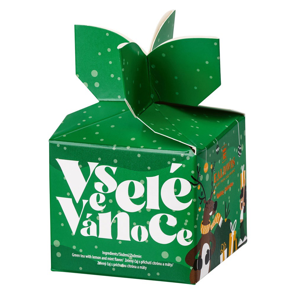 Dárková krabička s čaji Ealdwin, 5 sáčků. Modrá krabička obsahuje černý čaj s příchutí jablka a broskve, červená obsahuje zelený čaj s příchutí jahody a zelená krabička obsahuje zelený čaj s příchutí citrónu a máty. Dodáváno v mixu, barvu nelze vybrat. 71 × 115 × 71 mm