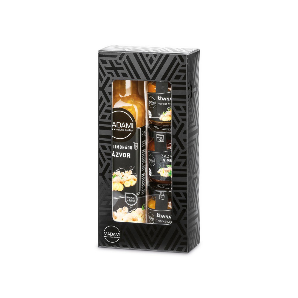 Zázvorový dárkový set, obsahuje ovocný koncentrát se zázvorem (250 ml), Zázvor v medu (68 g), pečený čaj Citrusová směs se zázvorem (2× 55 ml). 100 × 220 × 50 mm