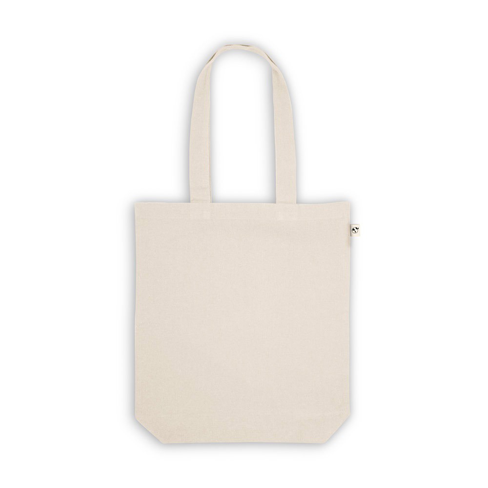 Taška vyrobená ze recyklované bavlny (70%) a polyesteru (30% rPET) (280 g/m²), s uchy 65 cm. Recyklovaná bavlna je jednobarevná a nebarvená. Surovina se používá ve své původní podobě a barvě, bez použití barvicích nebo bělících chemikálií, což přispívá k nižšímu dopadu. Pevná barva se získá výběrem recyklované příze se stejným odstínem a mohou se objevit nečistoty a barevné odchylky. 380 x 400 x 100 mm