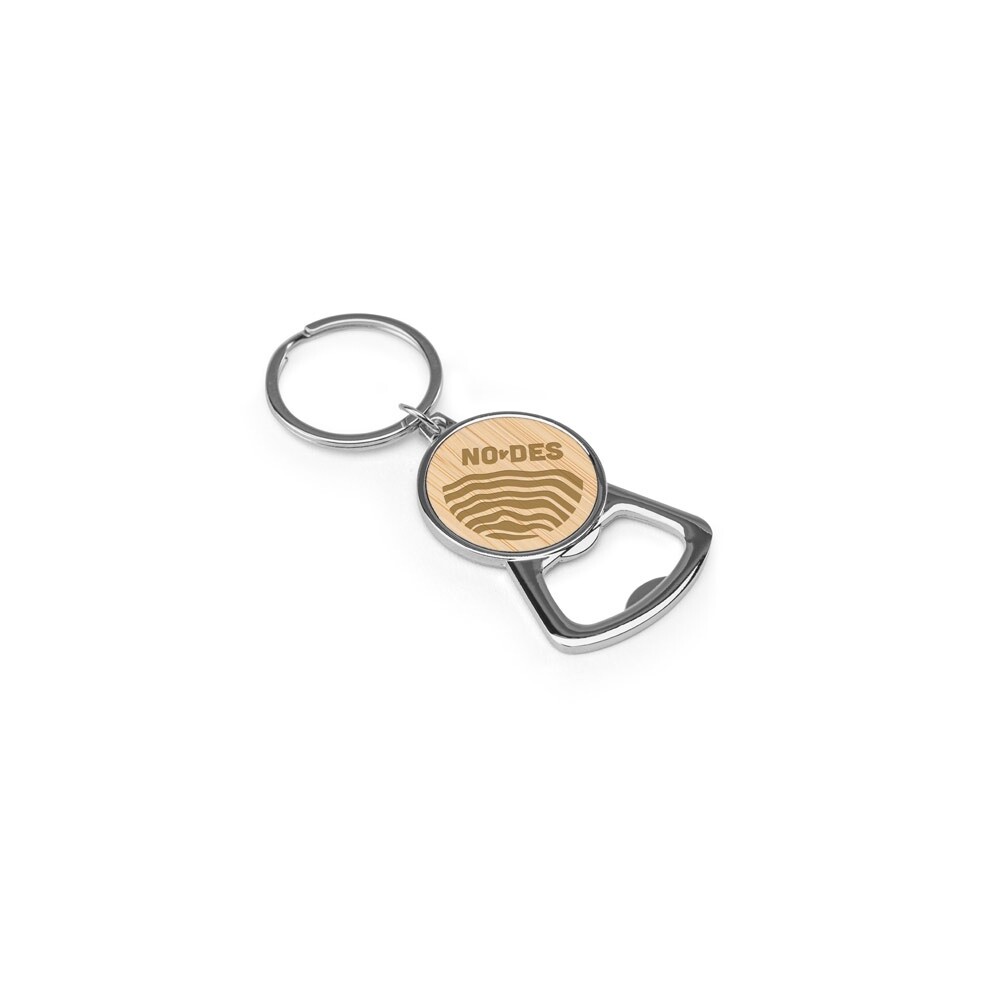 Kovová klíčenka v kulatém tvaru ze zinku a bambusu. Díky otvíráku je tento přívěšek na klíče praktickým doplňkem, který je dobré mít vždy po ruce. Dodáváno v polstrované dárkové krabičce z kraftového papíru. Celkem: 90 x 39 x 3 mm | Taška: 100 x 55 mm