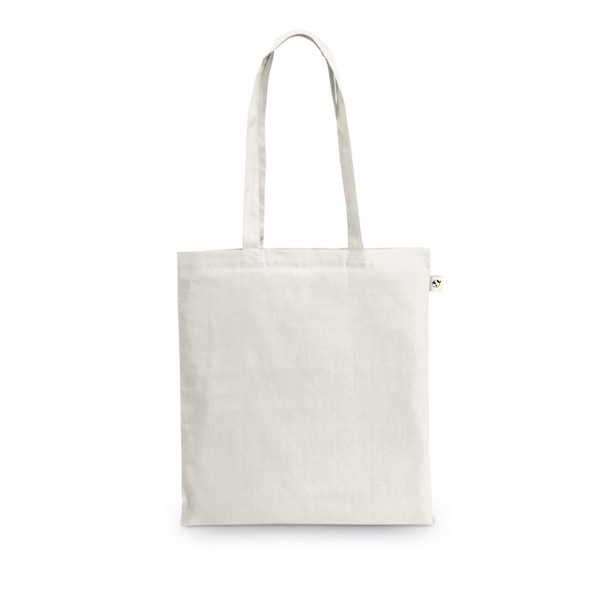 Taška vyrobená ze recyklované bavlny (70 %) a polyesteru (30 % rPET) (150 g/m²), s uchy 65 cm. Recyklovaná bavlna je jednobarevná a nebarvená. Surovina se používá ve své původní podobě a barvě, bez použití barvicích nebo bělících chemikálií, což přispívá k nižšímu dopadu. Pevná barva se získá výběrem recyklované příze se stejným odstínem a mohou se objevit nečistoty a barevné odchylky. 380 x 420 mm