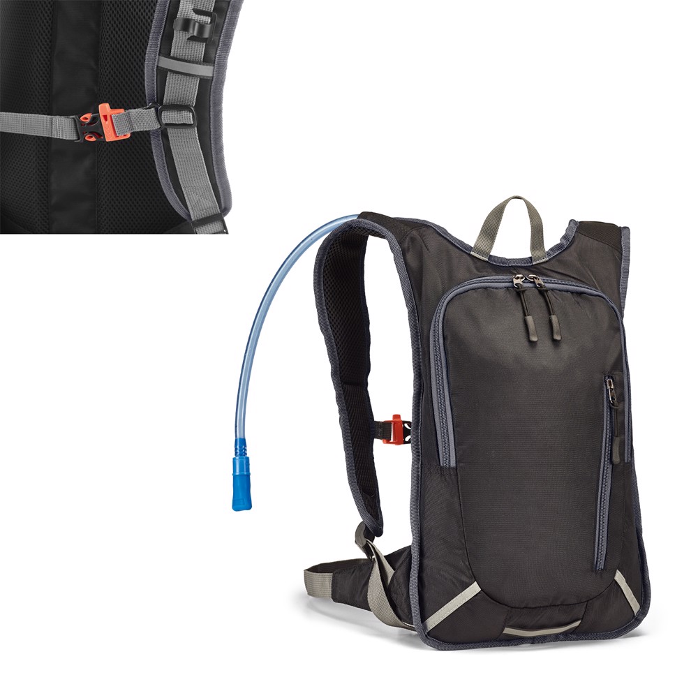 Sportovní batoh 420D. Hlavní přihrádka s podšívkou a přední kapsa se zipem. Přední část s reflexními prvky. Záda a popruhy jsou pro větší komfort při nošení vypolstrované. Na zádech se rovněž nachází popruh se sponami, aby se batoh lépe přizpůsobil tělu, usnadnil přenos věcí a vyhověl požadavkům na dlouhodobé používání. Batoh obsahuje vak na vodu s brčkem a kapacitou až 2 litry. Batoh a vak jsou dodávány zvlášť. 265 x 410 x 55 mm