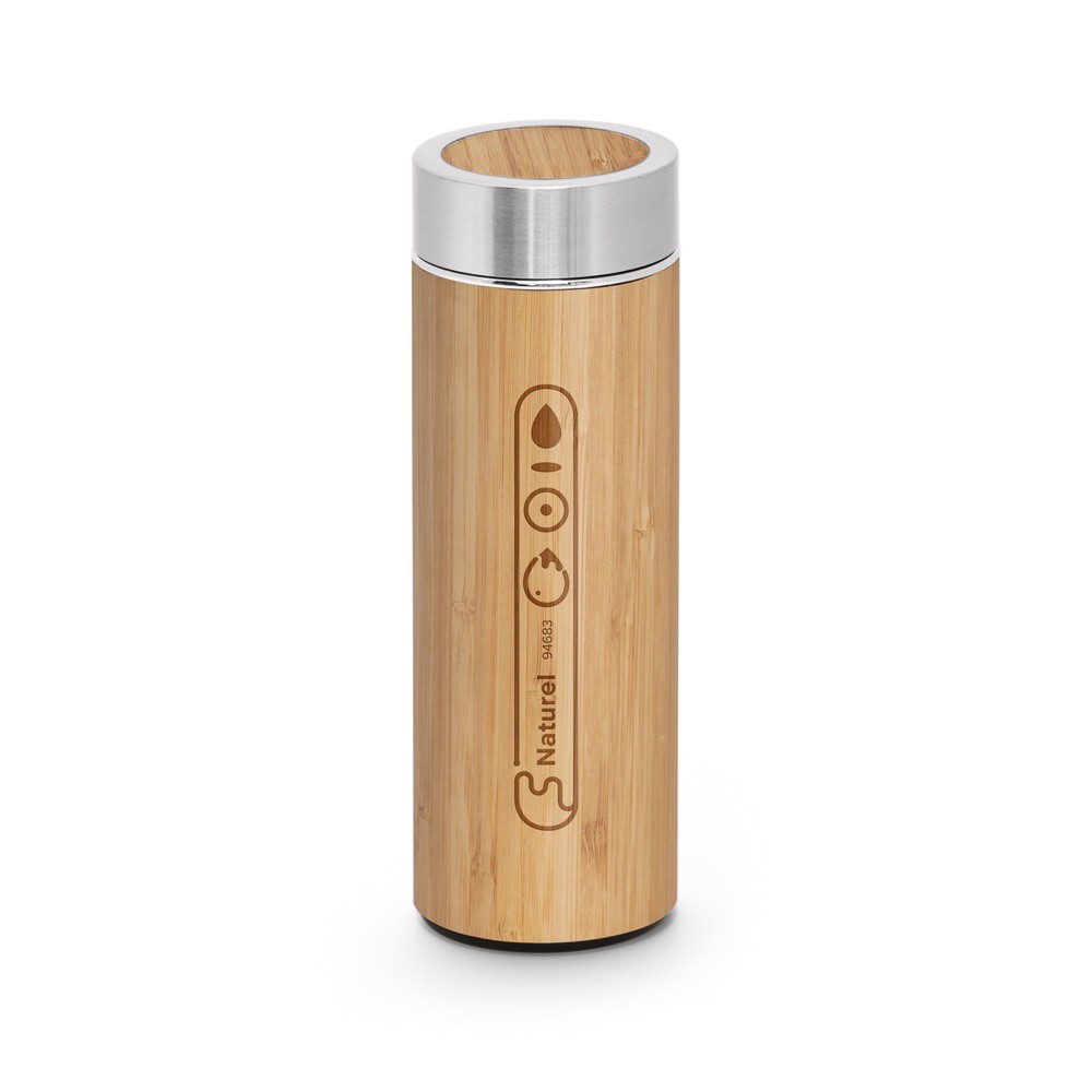 Bambusová a nerezová (90 % recyklované nerezové oceli) termoska s dvojitým vakuově izolovaným tělem a čajovým infuzérem. Tato láhev má objem až 430 ml a je dodávána v dárkové krabičce. ø69 x 207 mm | Krabička: 72 x 210 x 72 mm