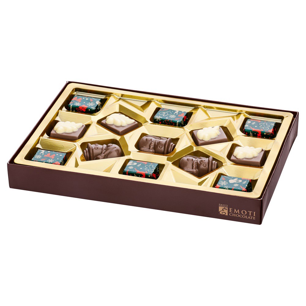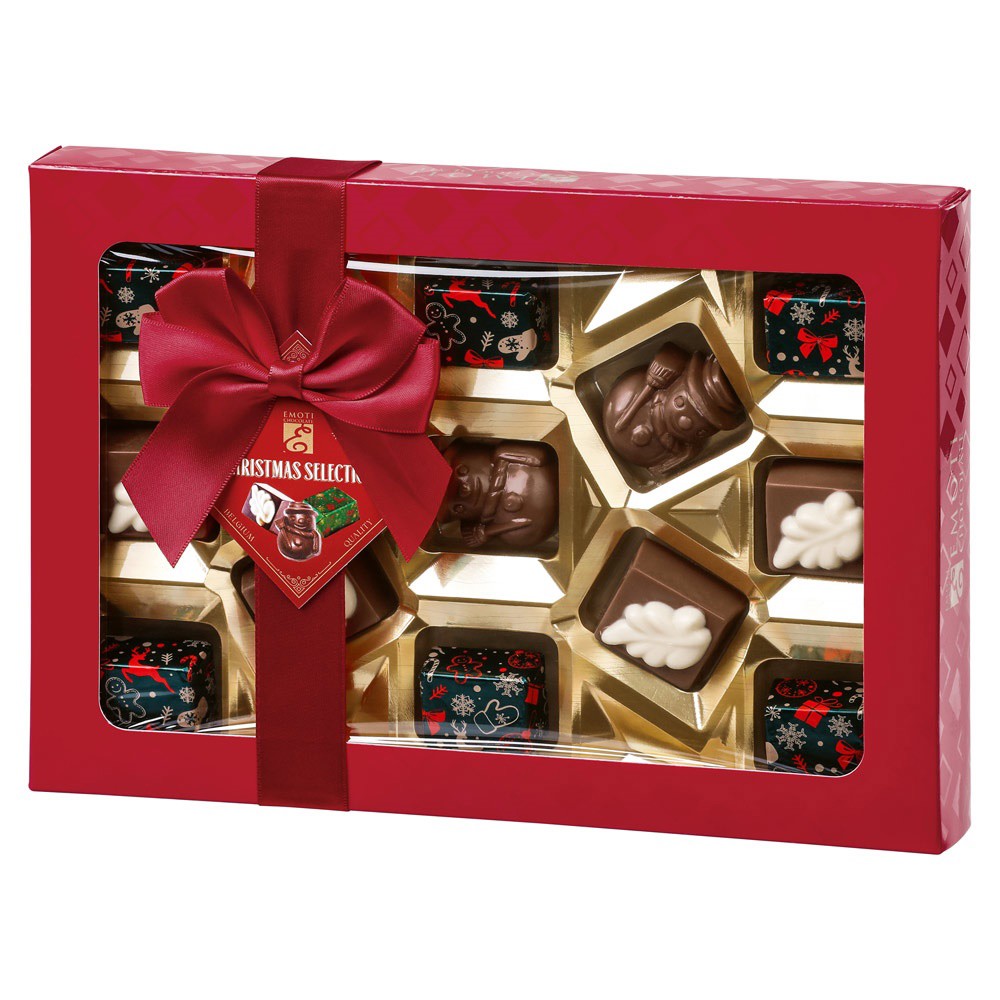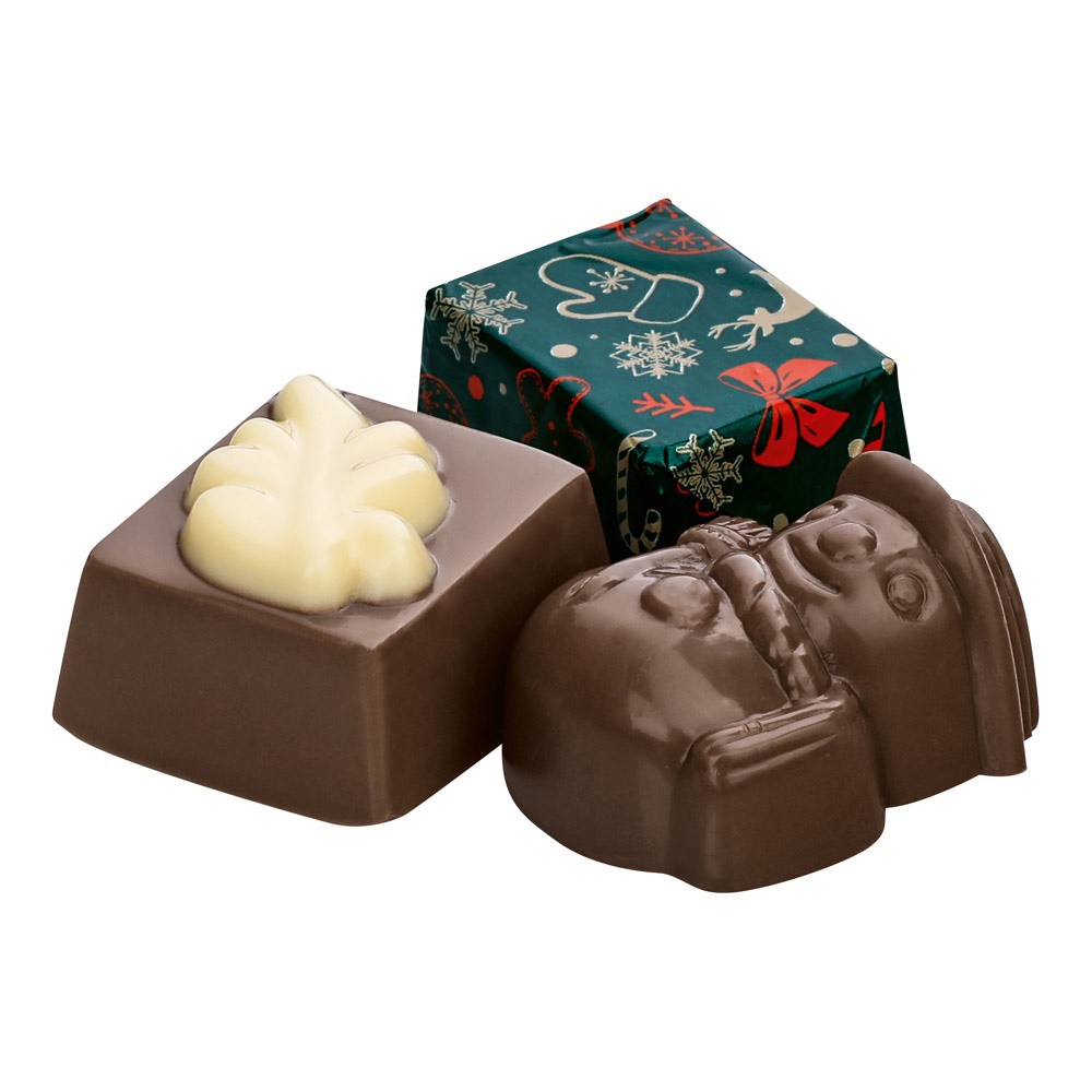 Výběr vánočních pralinek z mléčné čokolády, lískooříšková náplň. Převázáno saténovou mašlí, 195 g. 253 × 30 × 176 mm