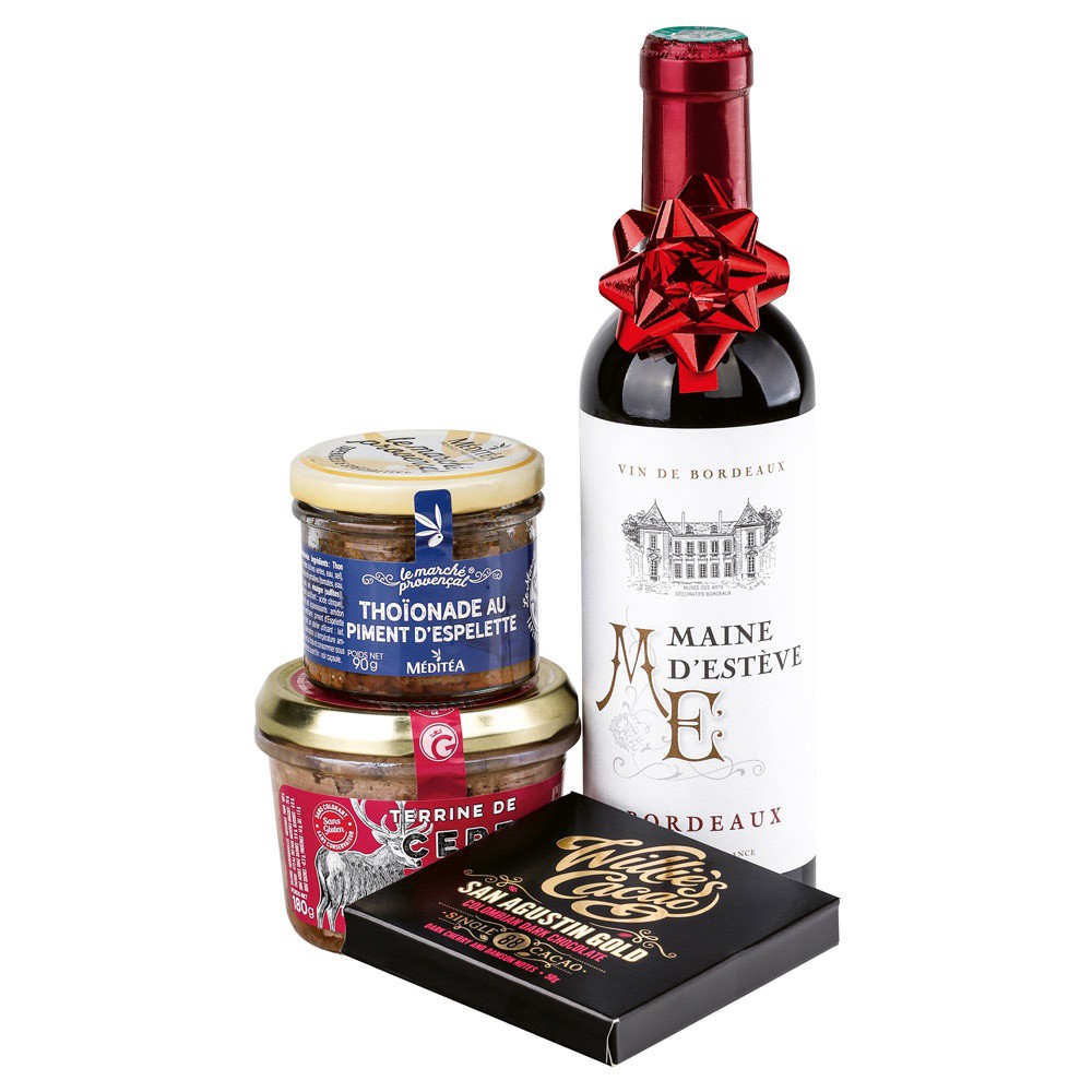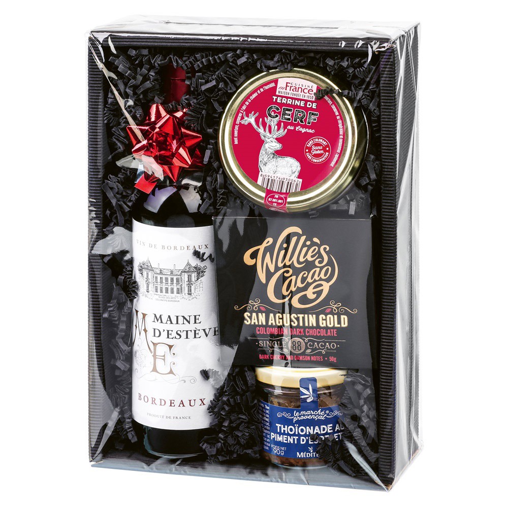 Dárkový set v krabici. Obsahuje víno Maine d'Esteve - AOP Bordeaux francouzské červené víno (375ml), francouzskou specialitu z tuňáka s paprikou Espelette (90 g), jelení paštiku s koňakem (180 g) a Willie's Cacao Colombian Gold San Augustin 88 % čokoládu (50 g). 175 × 260 × 68 mm