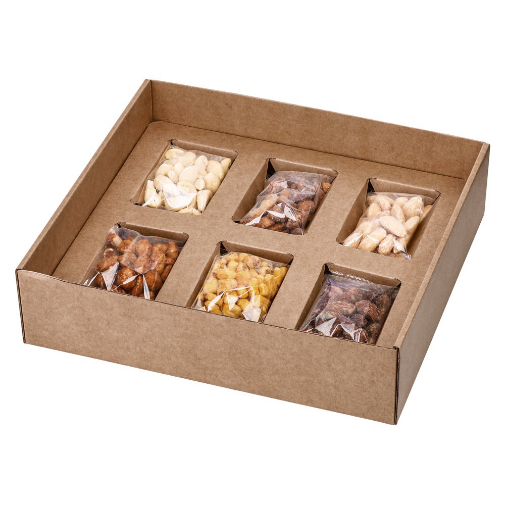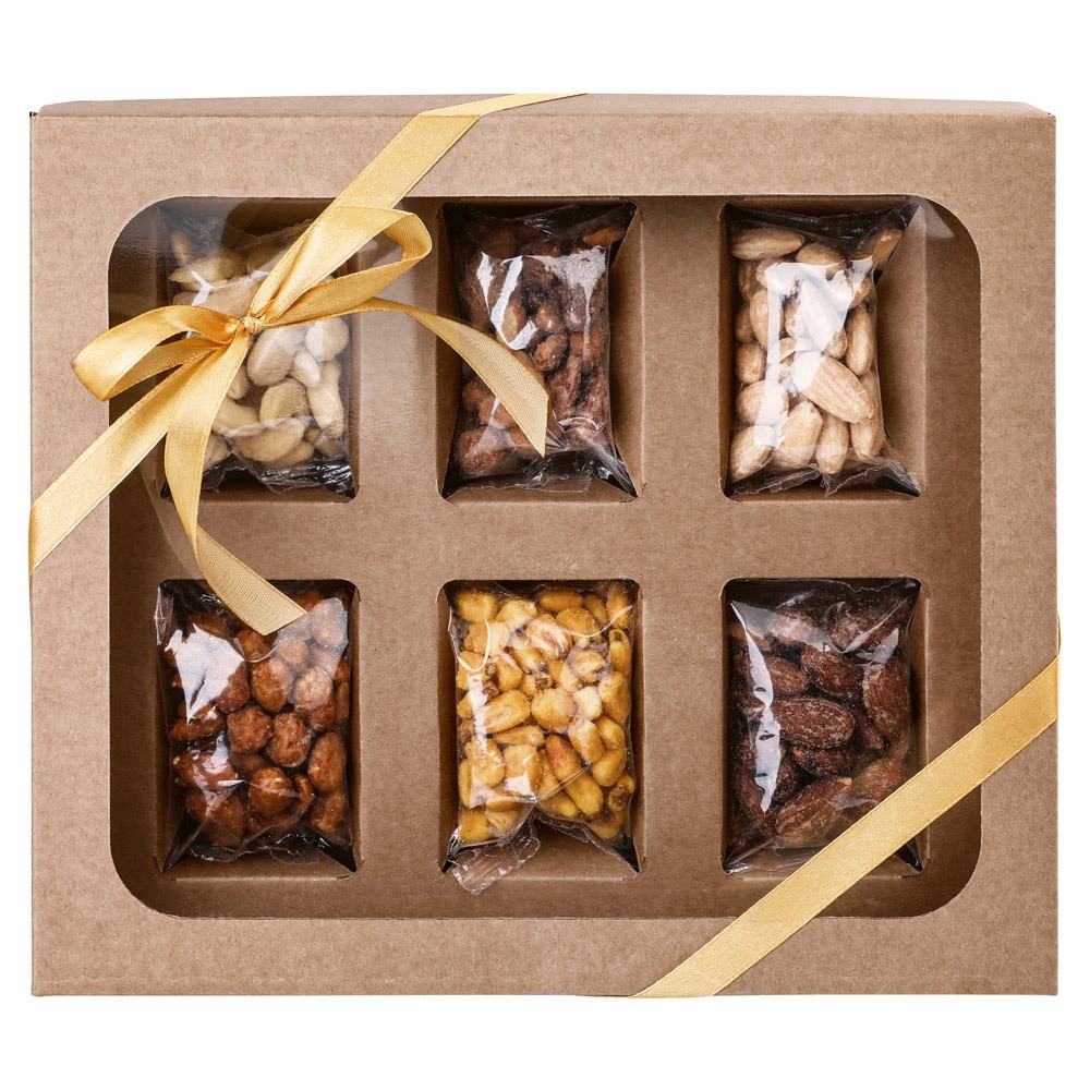 Dárková krabička se stuhou, 285 g. Obsahuje mandle uzené (50 g), mandle solené (50 g), mix v medu a soli (50 g), arašídy karamel a vanilka (50 g), kešu natural (50 g), kukuřice hořčice a med (35 g). 250 × 220 × 60 mm