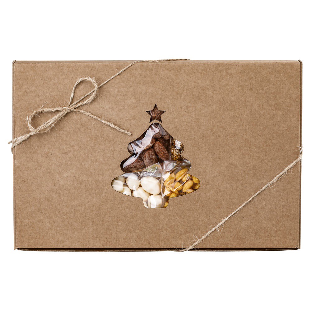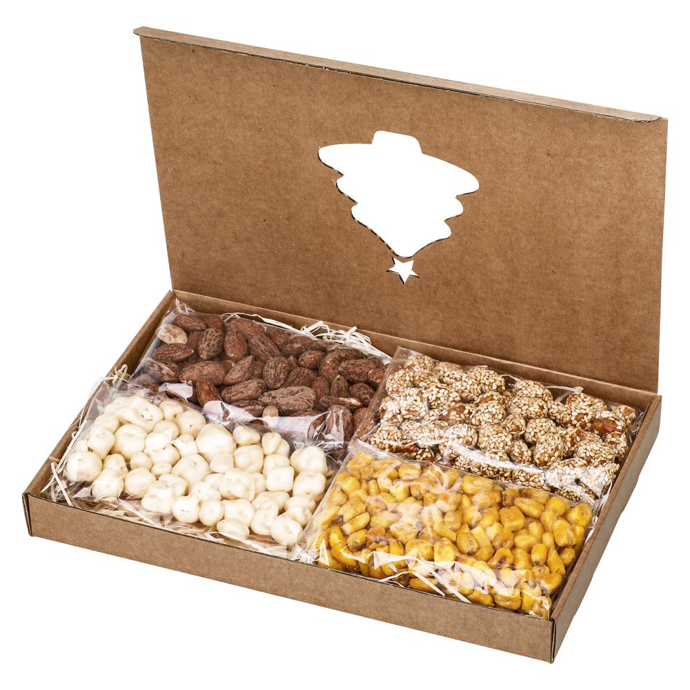 Dárková krabička s výřezem ve tvaru stromečku, 260 g. Obsahuje mandle uzené (70 g), arašídy v karamelu se sezamem (70 g), kukuřice v hořčici a medu (50 g) a meruňky v jogurtu (70 g). 245 × 160 × 25 mm