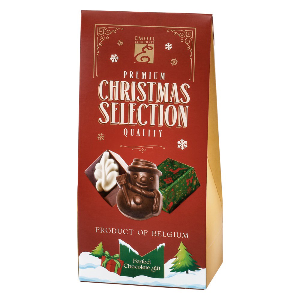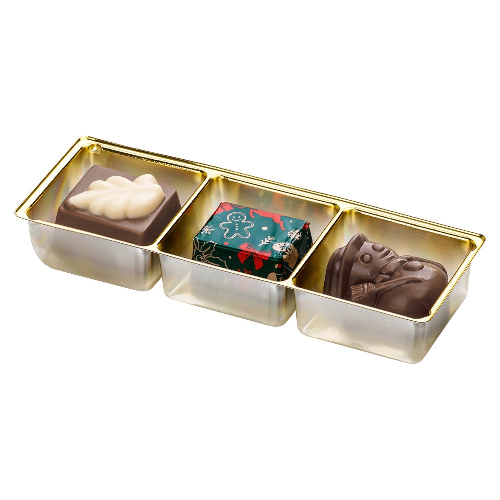 Výběr vánočních pralinek z mléčné čokolády s lískooříškovou náplní brésilienne, 45 g. 80 × 50 × 170 mm