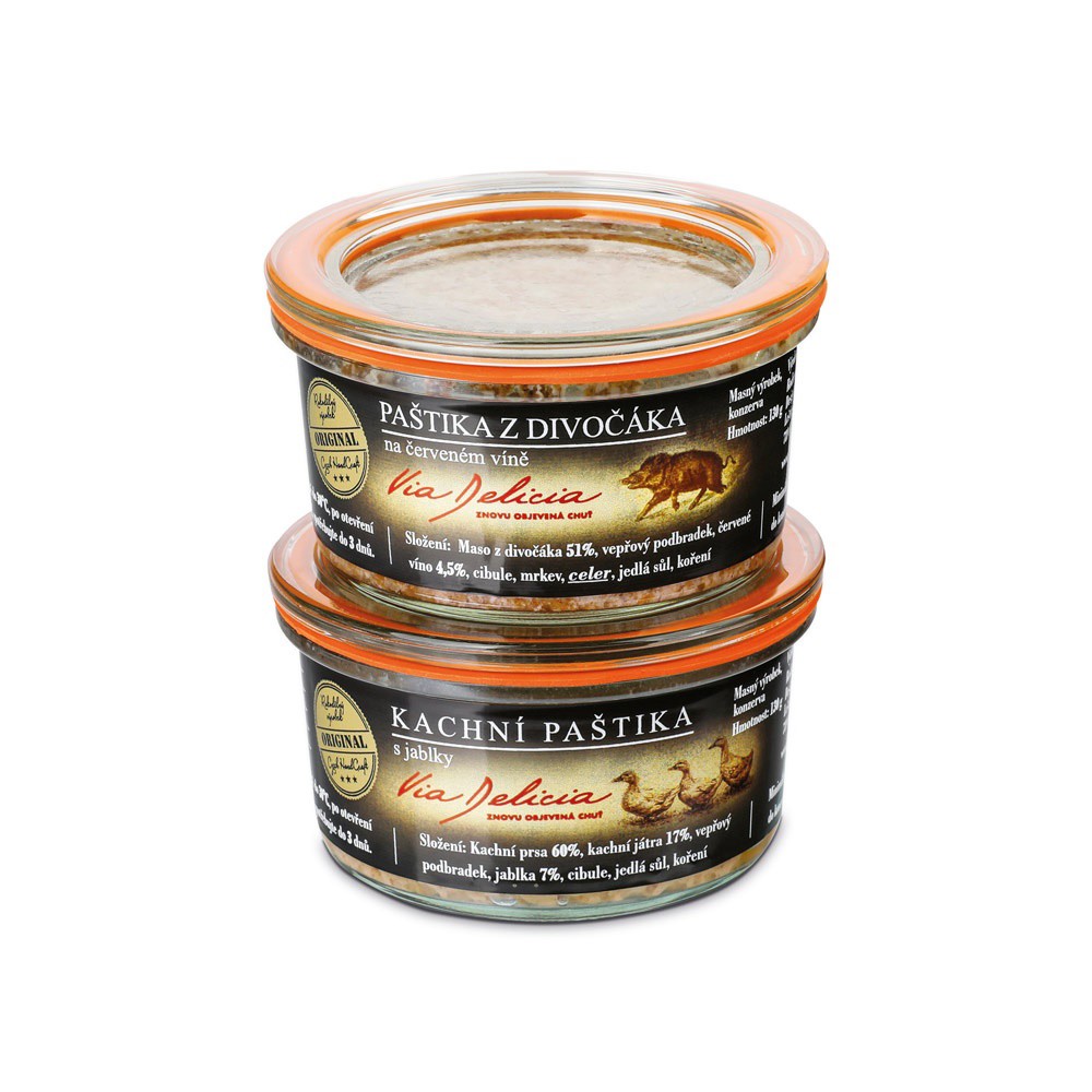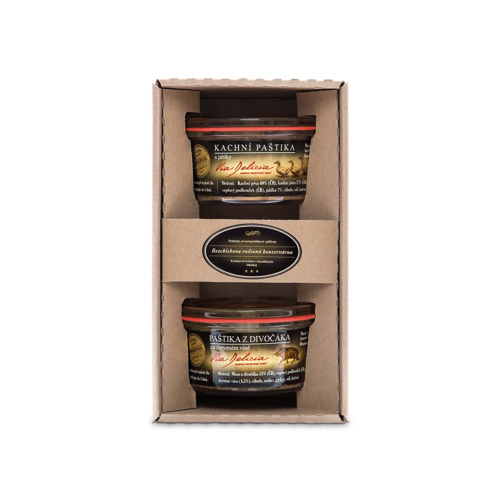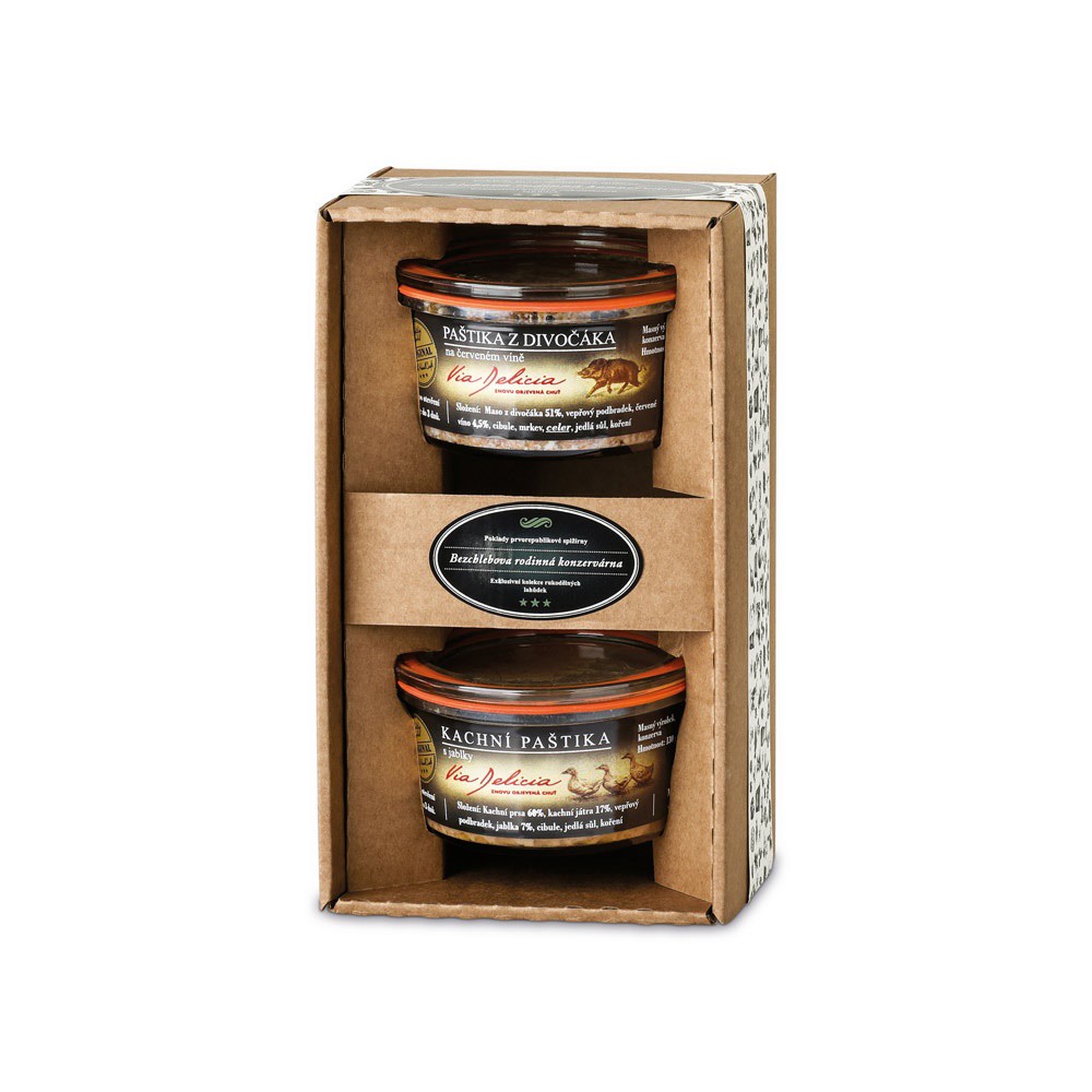 Dárkový set s výběrem paštik, obsahuje kachní paštiku s jablky a paštiku z divočáka na červeném víně, 2× 130 g. 115 × 200 × 100 mm