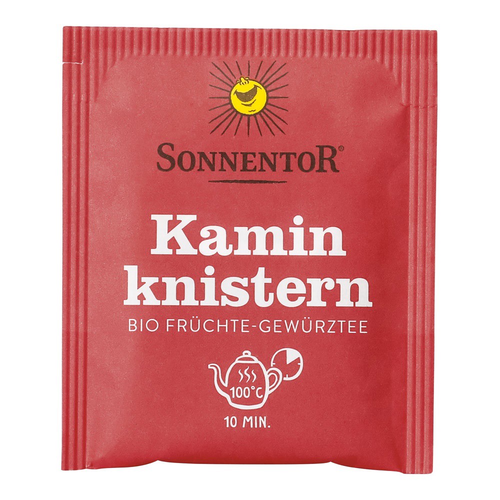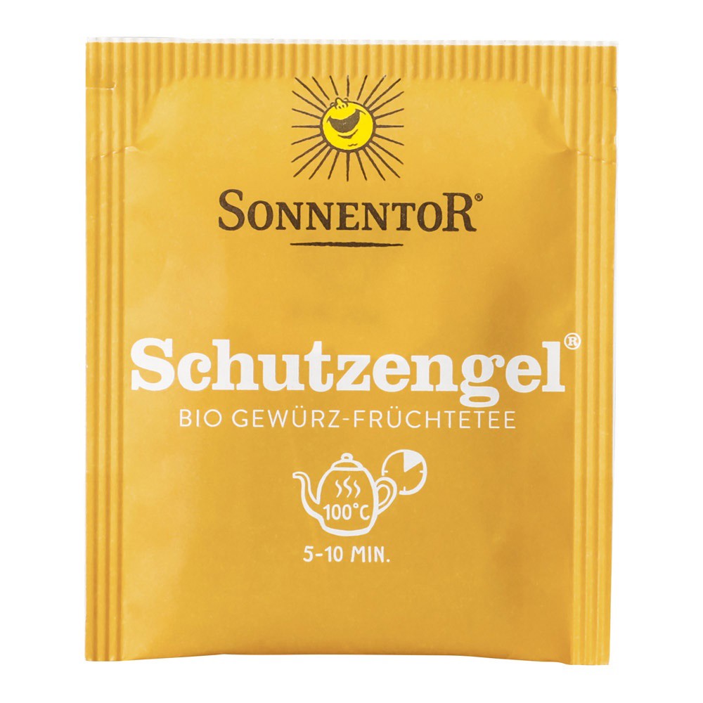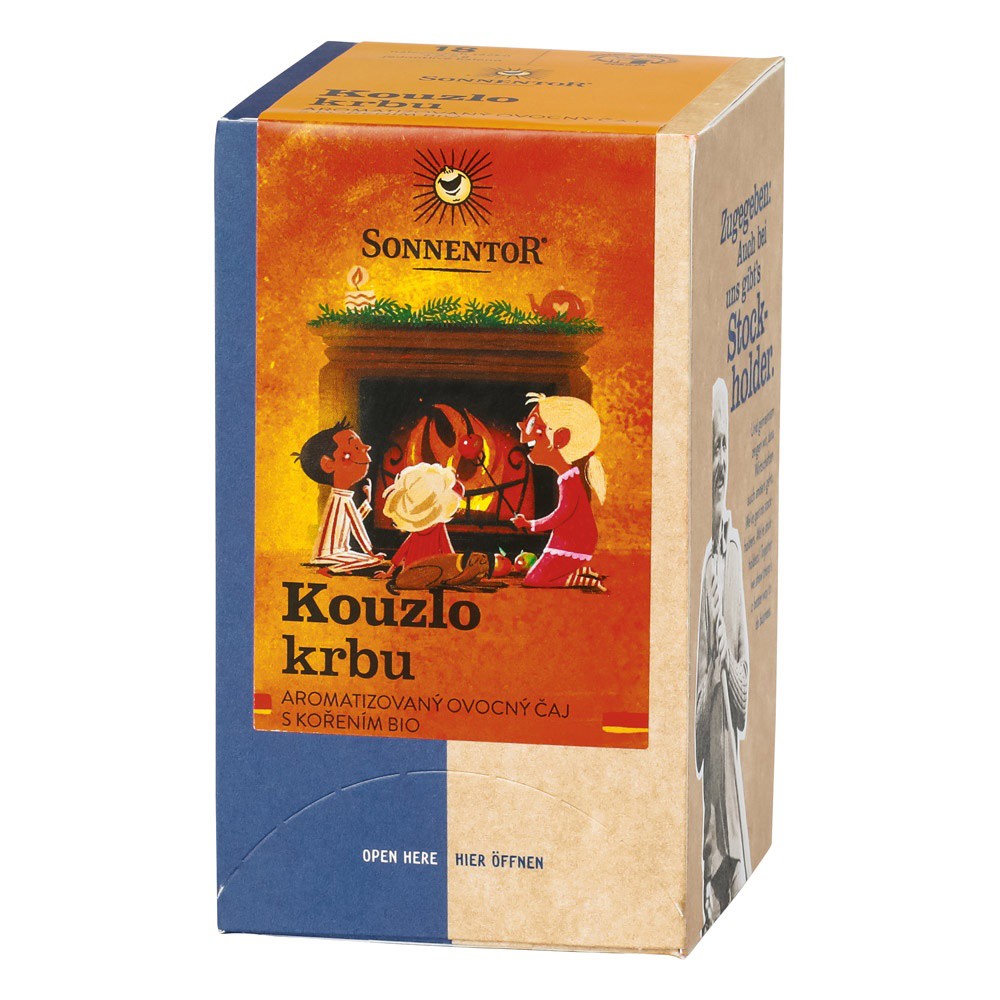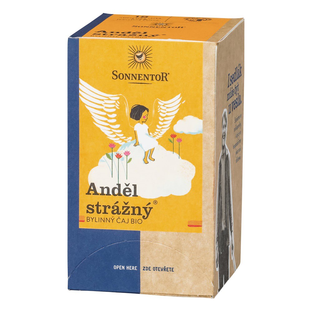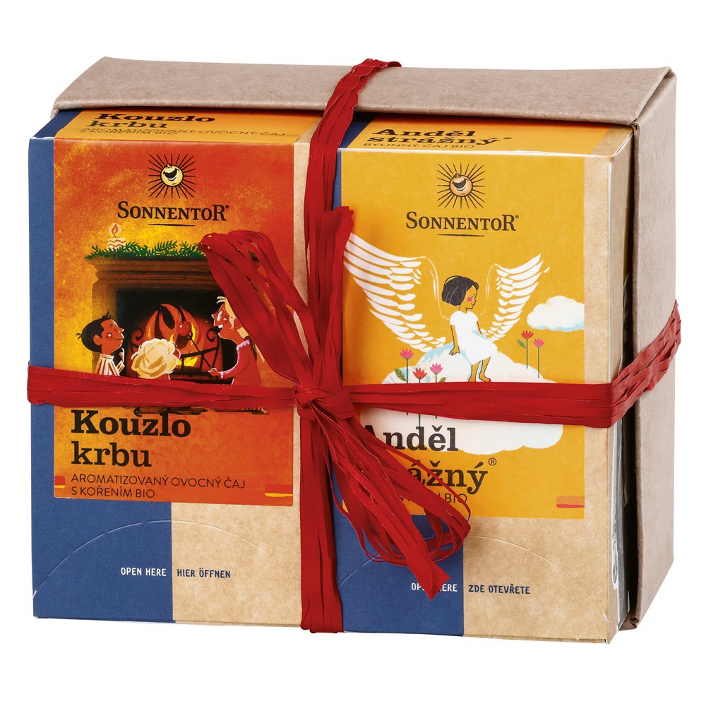 Dárková sada 2 biočajů Sonnentor. Obsahuje ovocný čaj Kouzlo krbu a bylinný čaj Anděl strážný, 2× 18 sáčků. 145 × 130 × 85 mm