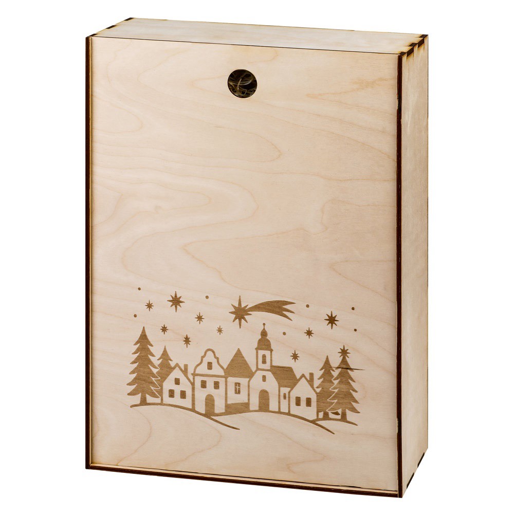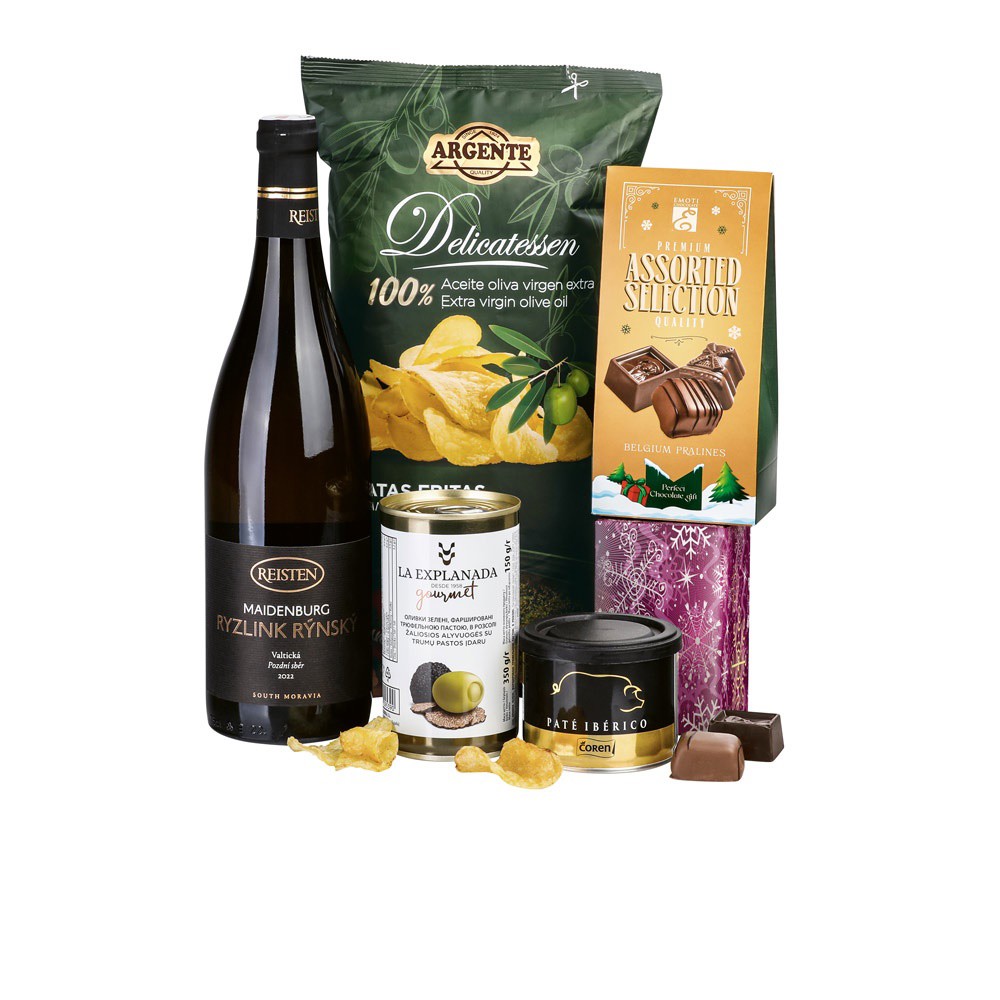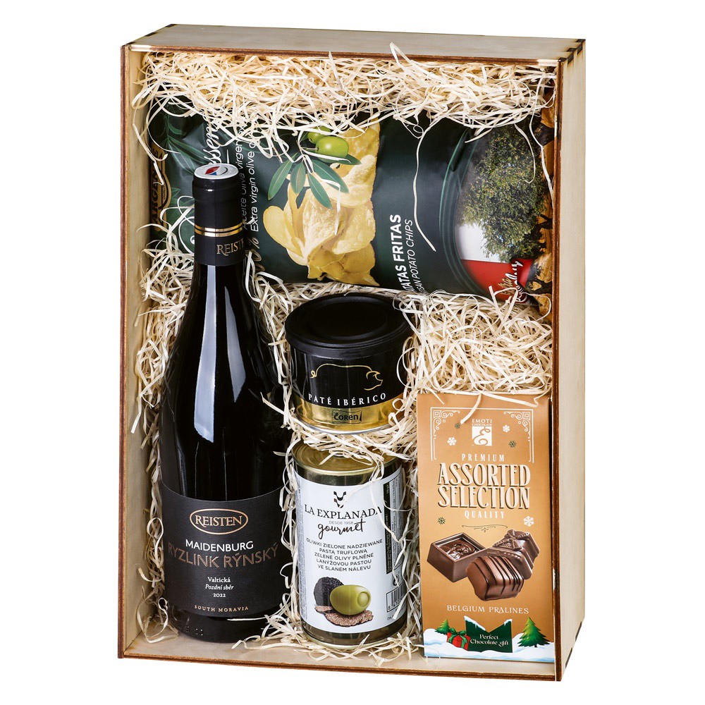 Dárkový set v dřevěné krabici s víkem s vylaserovaným zimním motivem. Obsahuje bílé víno suché s přívlastkem pozdní sběr Ryzlink rýnský Reisten (750 ml), vepřovou paštiku Ibérico (200 g), olivy s lanýžovou pastou (350 g), lupínky v extra panenském olivovém oleji (160 g) a výběr pralinek z mléčné čokolády (48 g). 268 × 378 × 120 mm