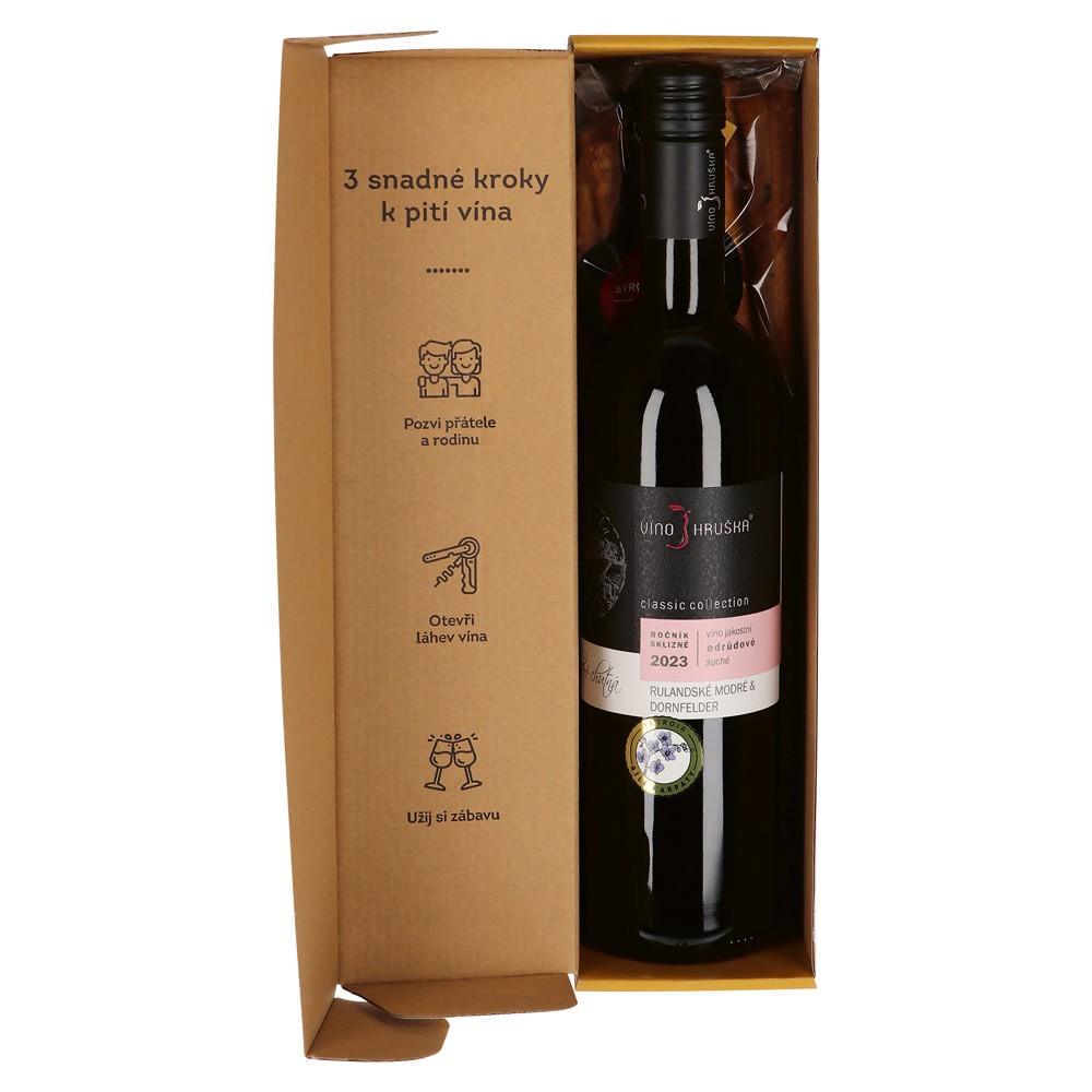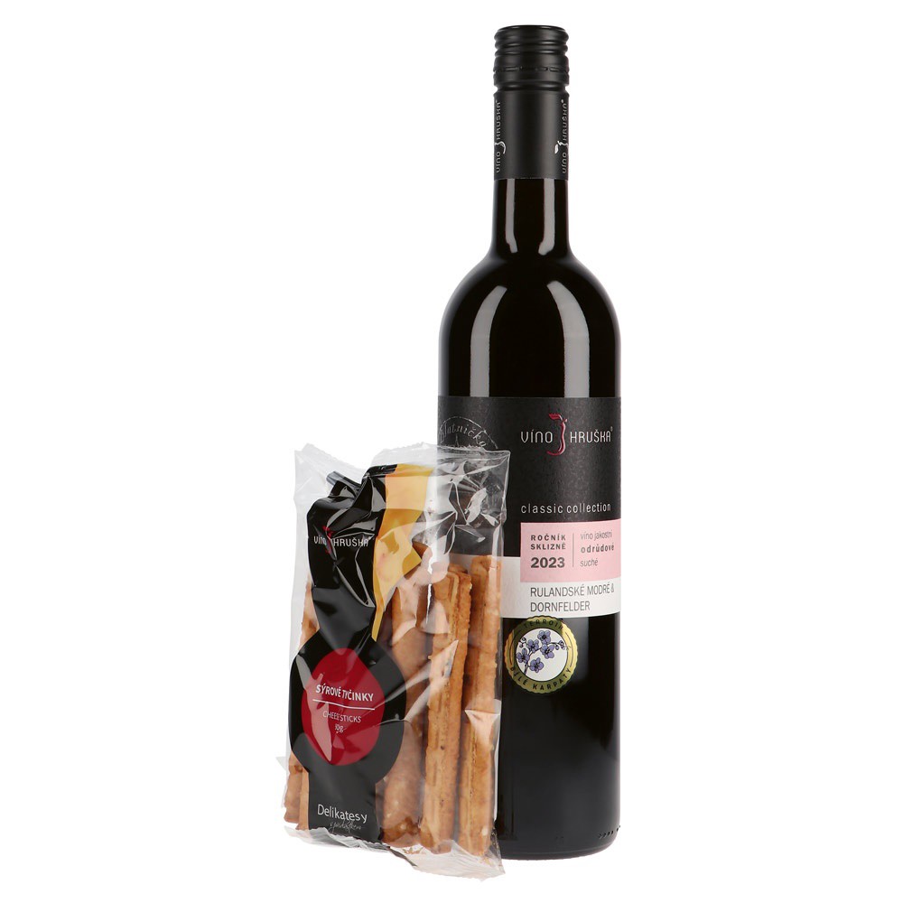 Rulandské modré & Dornfelder (750 m l) a sýrové tyčinky (90 g) v dárkové kazetě. 336 × 86 × 84 mm