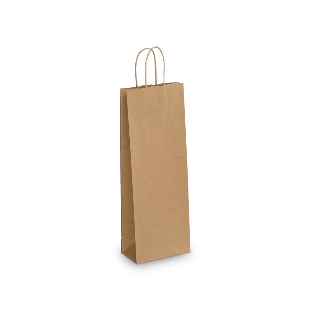 Taška na jednu láhev vína z kraftového papíru, kroucená papírova držadla. 140 × 390 × 80 mm