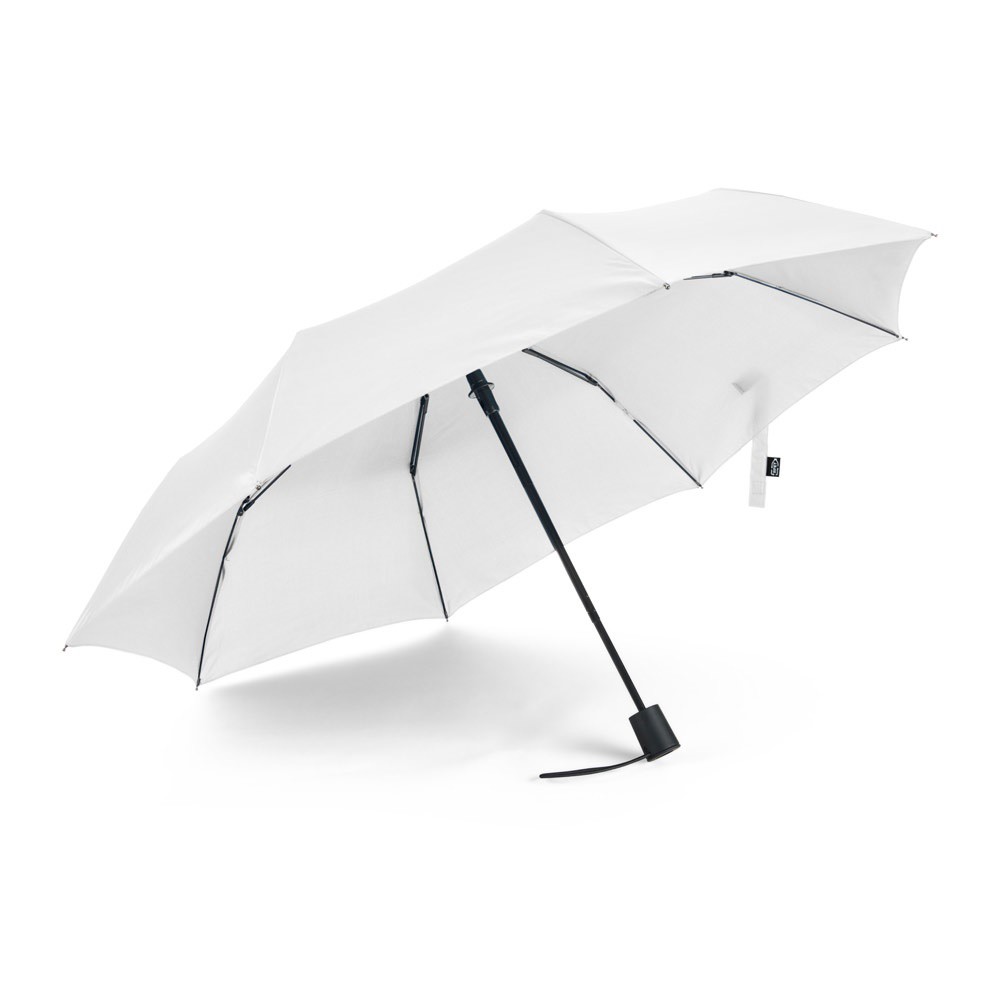 Součástí je deštník 2 v 1 s nákupní taškou z recyklovaného polyesteru. 21'' skládací deštník z recyklovaného polyesteru (100% rPET) pongee 190T, sklolaminátové tyče, kovová tyč a rukojeť z ABS (35% recyklace). Skládací deštník ve 3 částech, s automatickým otevíráním a větruodolný. Nákupní taška z recyklovaného polyesteru, kterou lze uložit pro přepravu nebo použít samostatně. Ø 970 x 290 mm | Obal: 420 x 390 mm