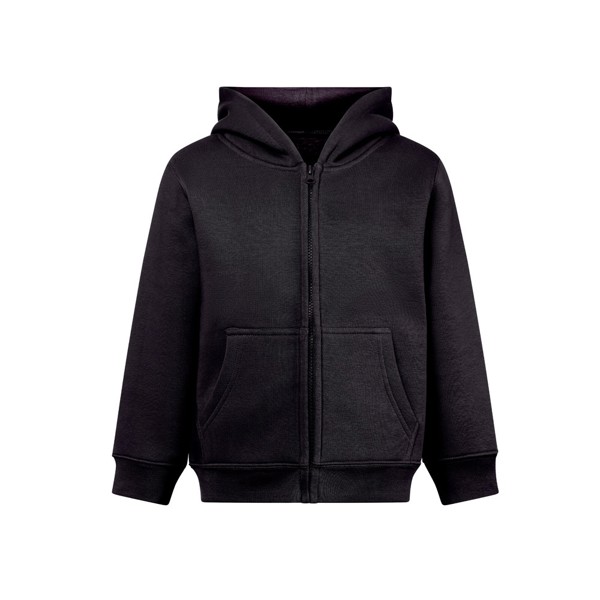 Dětská bunda s enzymovým zpracováním vyrobená z amerického terry (50 % bavlna z udržitelných zemědělských zdrojů) a 50 % recyklovaného polyesteru (320 g/m²). Kapsa bez šňůrky a podšívka z jersey ve stejné barvě jako bunda, splňující bezpečnostní normy Evropské unie. Obsahuje 1x1 žebrované manžety a spodní lem, 2 boční kapsy. Velikosti: 4, 6, 8, 10, 12