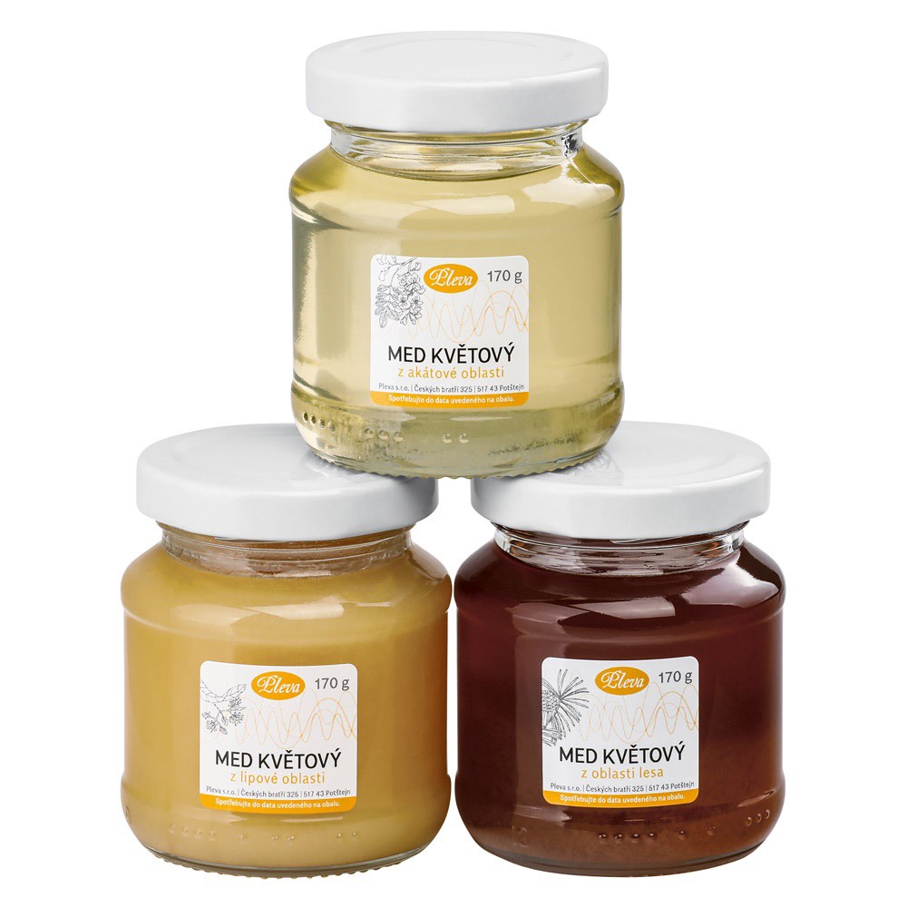 Medový set, obsahuje květový, lipový a lesní med z podhůří Orlických hor. 3× 170 g. 190 × 65 × 80 mm