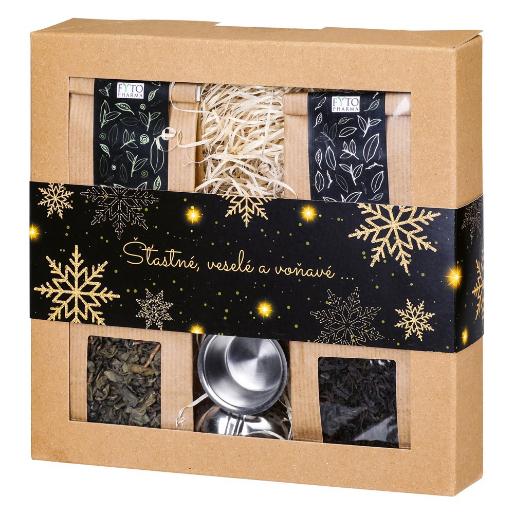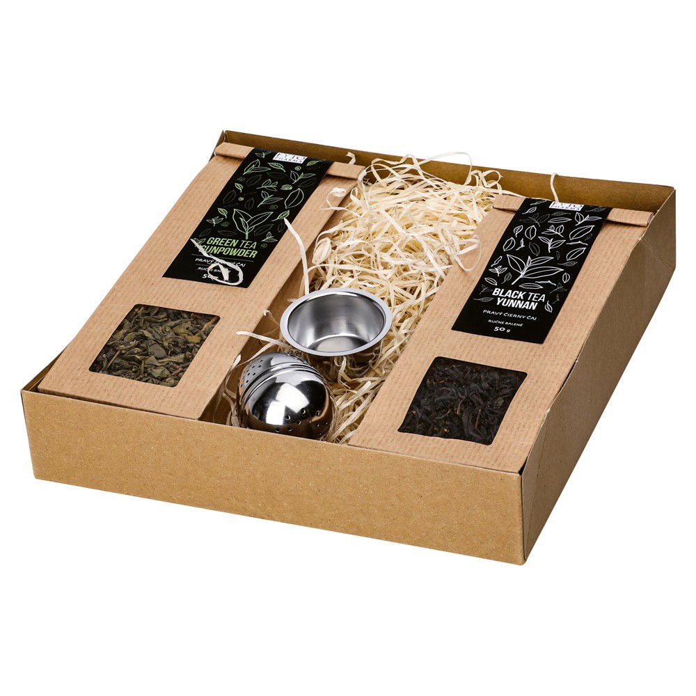 Dárková kazeta se sypanými čaji a sítkem. Zelený čaj - gunpowder (50 g), černý čaj (50 g) - yunnan. 225 × 220 × 45 mm