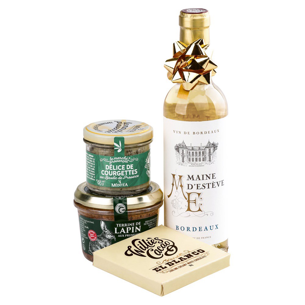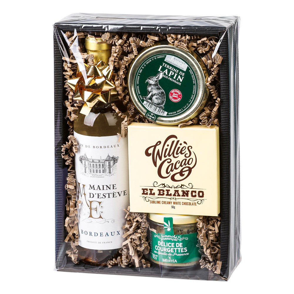 Dárkový set v černé krabici, obsahuje Willie's Cacao bílá čokoláda El Blanco (50 g), králičí terinu se švestkami (180 g), cuketovou pochoutku s bazalkou z Provence (90 g) a francouzské sladké bílé víno Plaisir Gascon IGP, Cotes de Gascogne (0.375 l). 175 × 260 × 68 mm