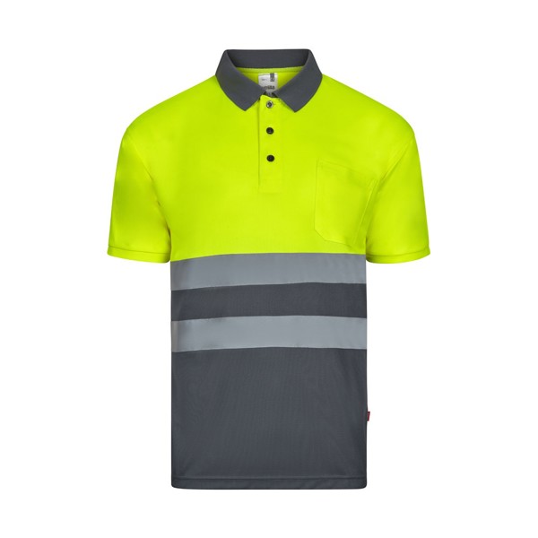 Polokošile s krátkým rukávem (140 g/m²) z polyesteru (100 %). Kontrastní knoflíky a žebrovaný límec. Reflexní pruhy na hrudi a jedna náprsní kapsa. Výrobek v souladu s nařízením EU 2016/425, certifikovaný podle EN20471 a třídy č. 1. Velikost: S, M, L, XL, 2XL, 3XL