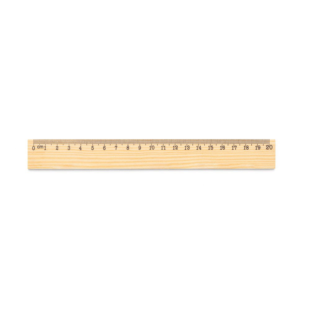 Pravítko z borovicového dřeva s 20cm stupnicí potištěnou černou barvou. Protože je výrobek vyroben z přírodních materiálů, barva a velikost výrobku a výsledek tisku se mohou u jednotlivých výrobků lišit. 209 x 25 mm